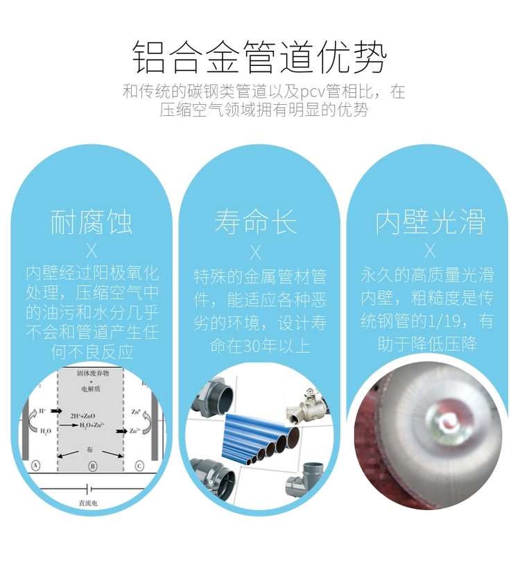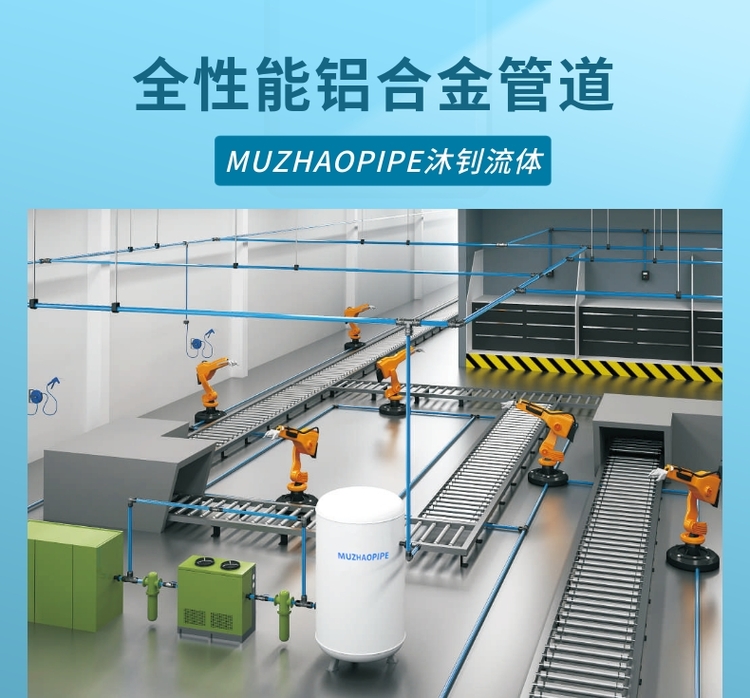 光滑的鋁管經過陽極氧化處理,從生成點到各個使用點之間輸送穩定的高品質壓縮空氣,避免產生二次污染,同時保護下游設備和制造流程;