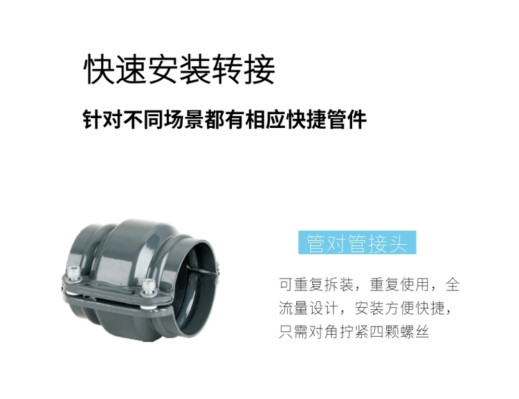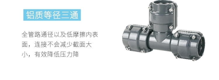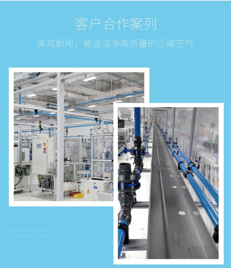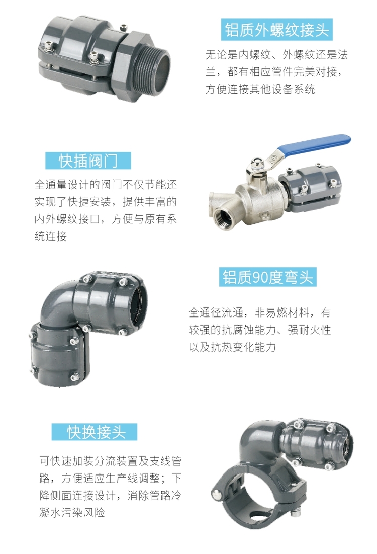 快速加裝及分流裝置,輕松、快捷安裝不費力;管路和連接件快速安裝,無需焊接,內置整體式面密封,確保無泄漏;產品具備靈活性,所有的部件易于調整、更換并可重復使用,因此有助于未來管網增設擴大,完美兼容各種工廠空間、管道設備。